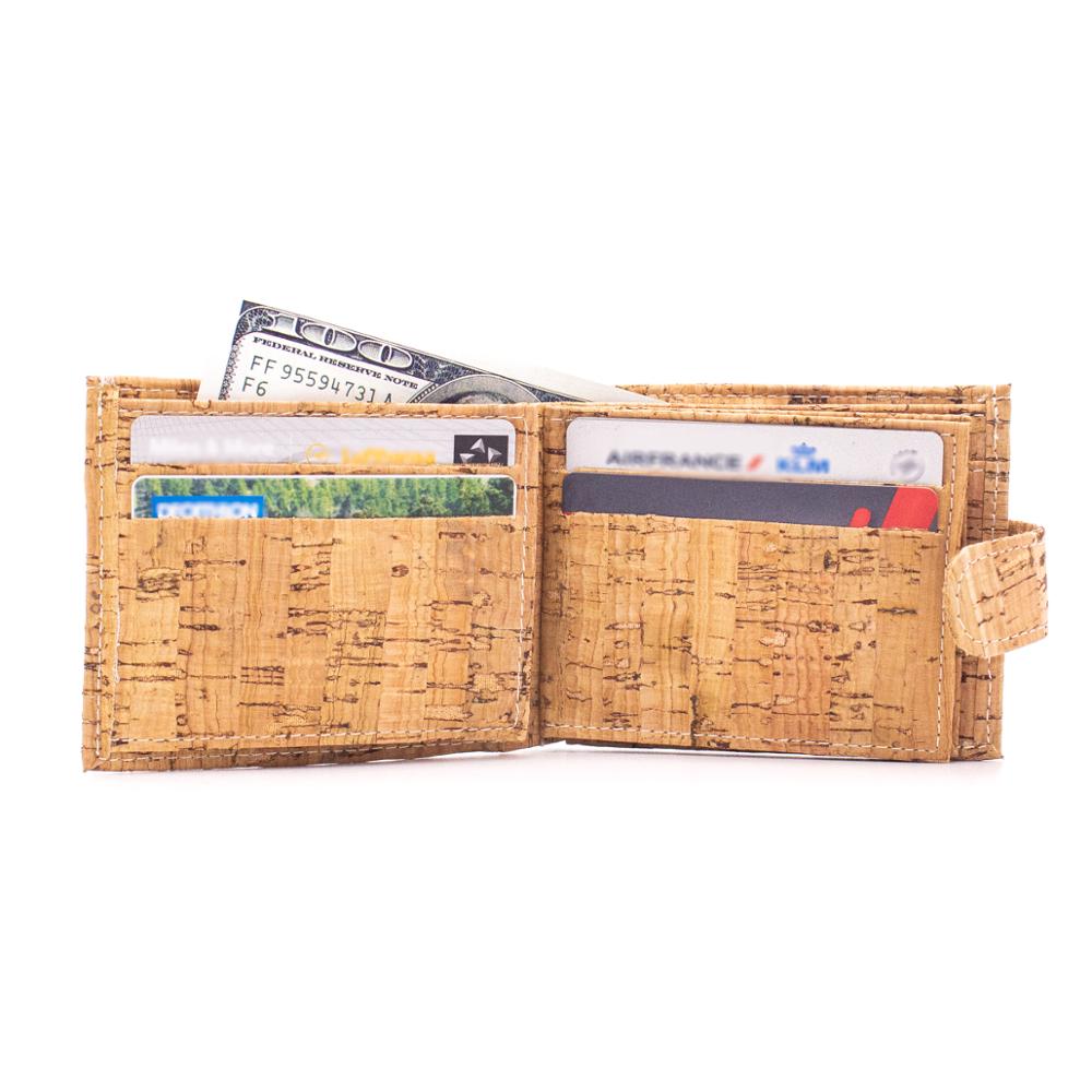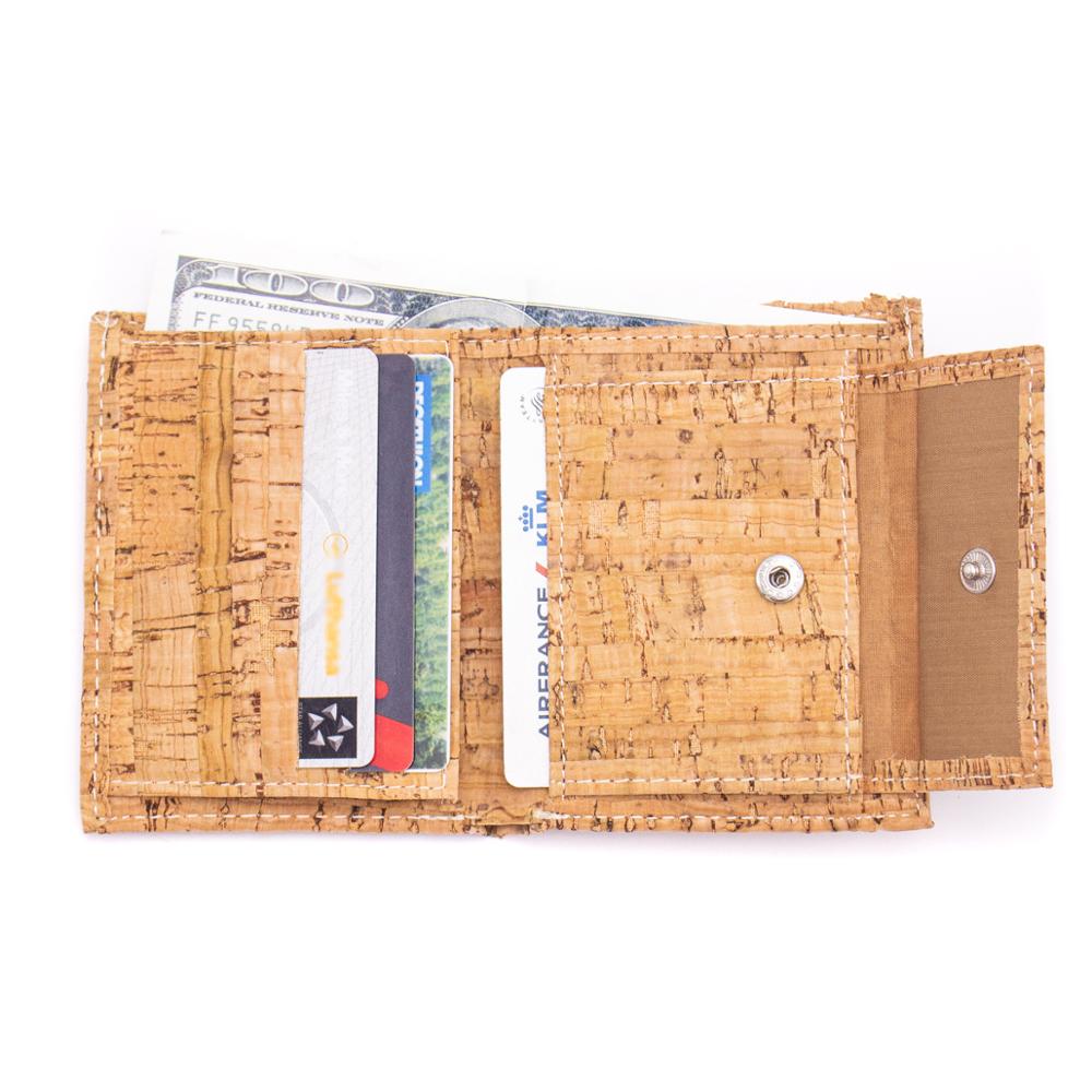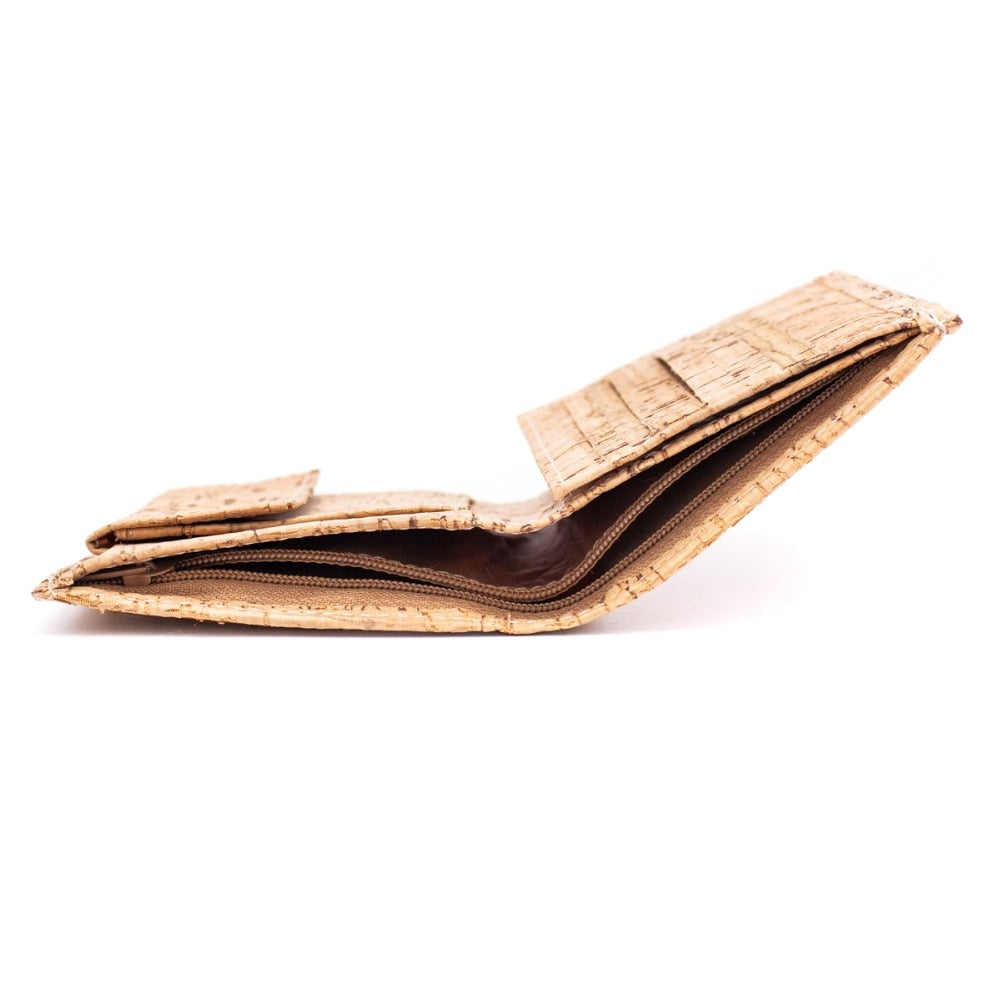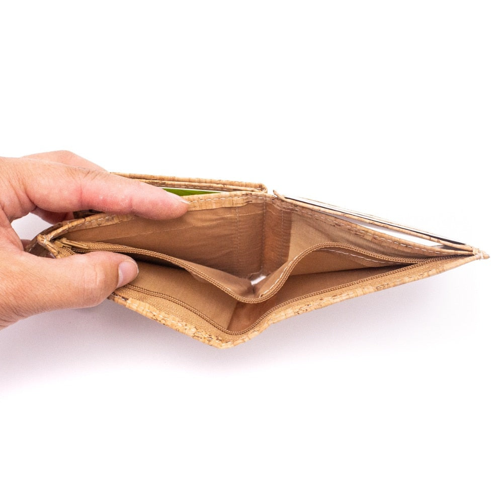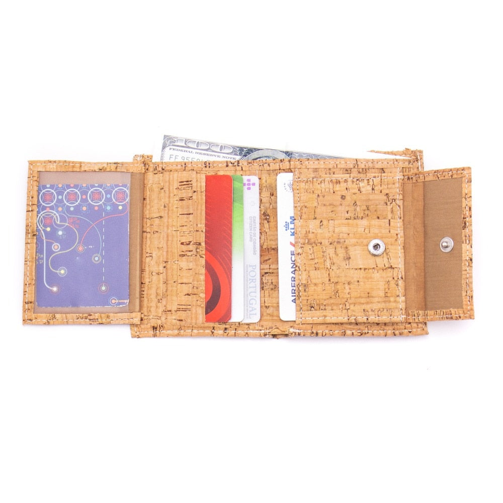 Cartera de corcho que contiene diferentes ranuras para tarjetas,bolsillo para monedas y compartimento para billetes.
