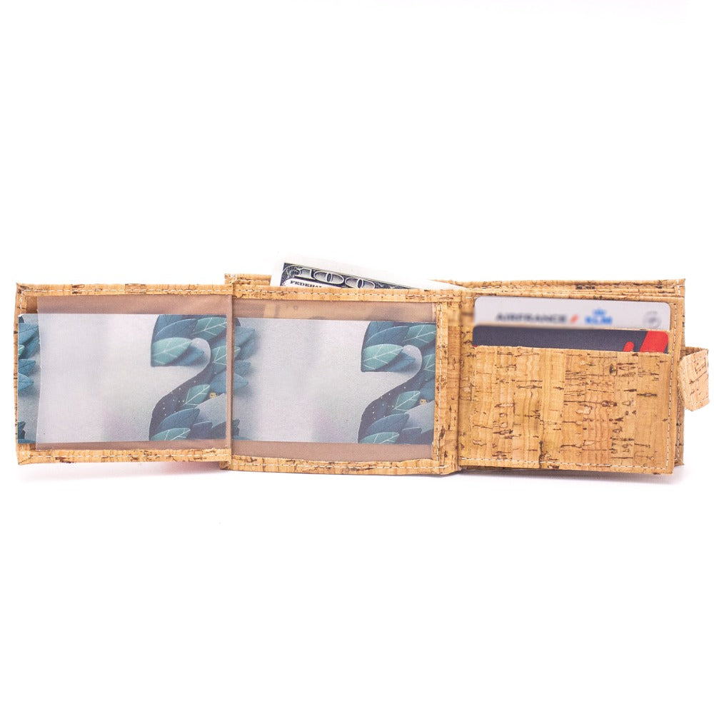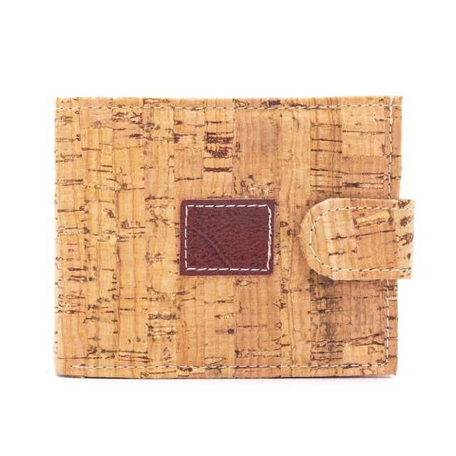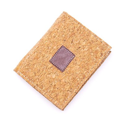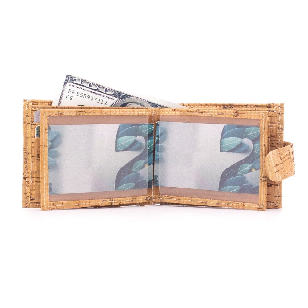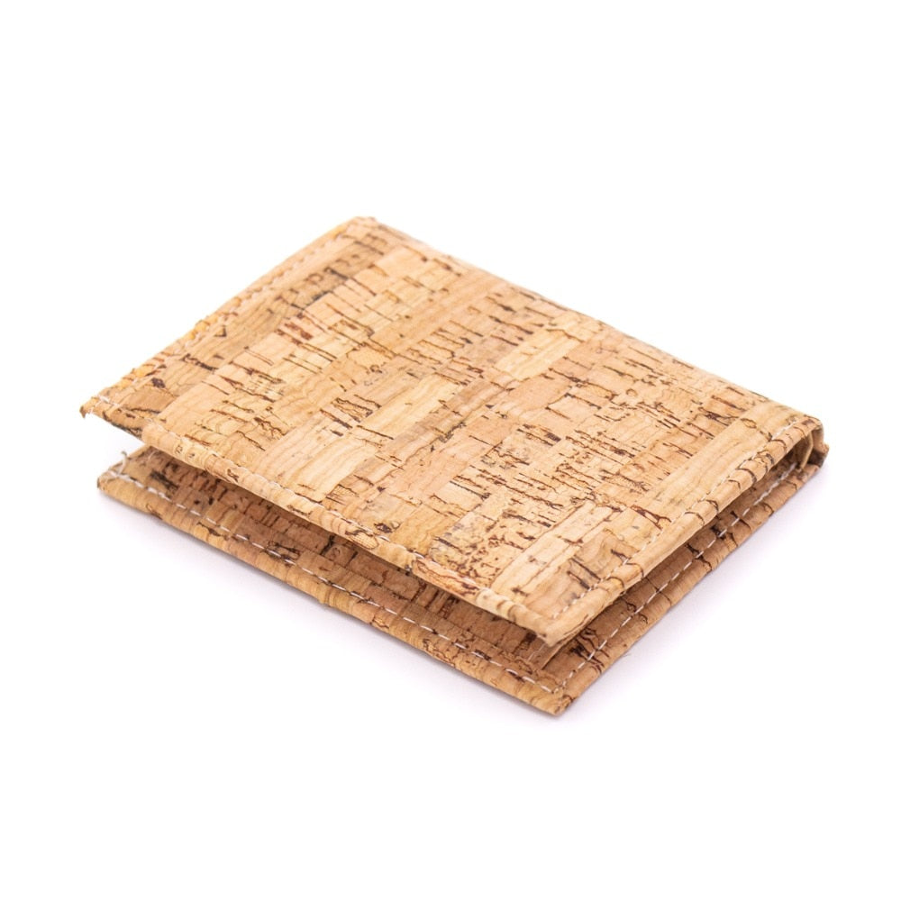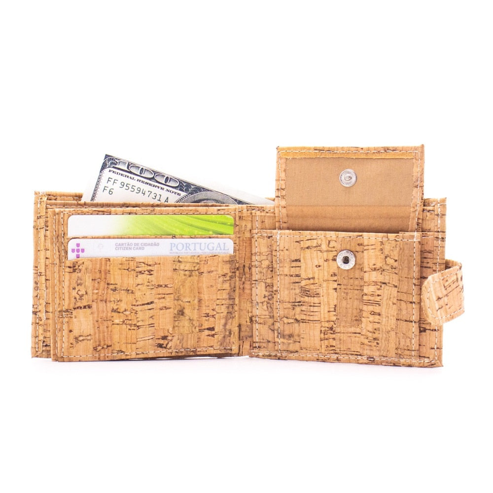 Cartera de corcho que contiene diferentes ranuras para tarjetas,bolsillo para monedas y compartimento para billetes.