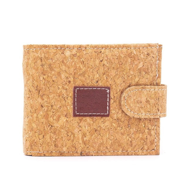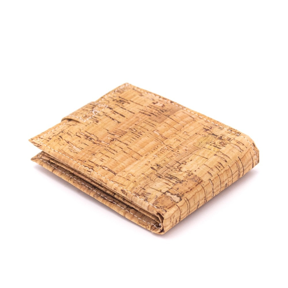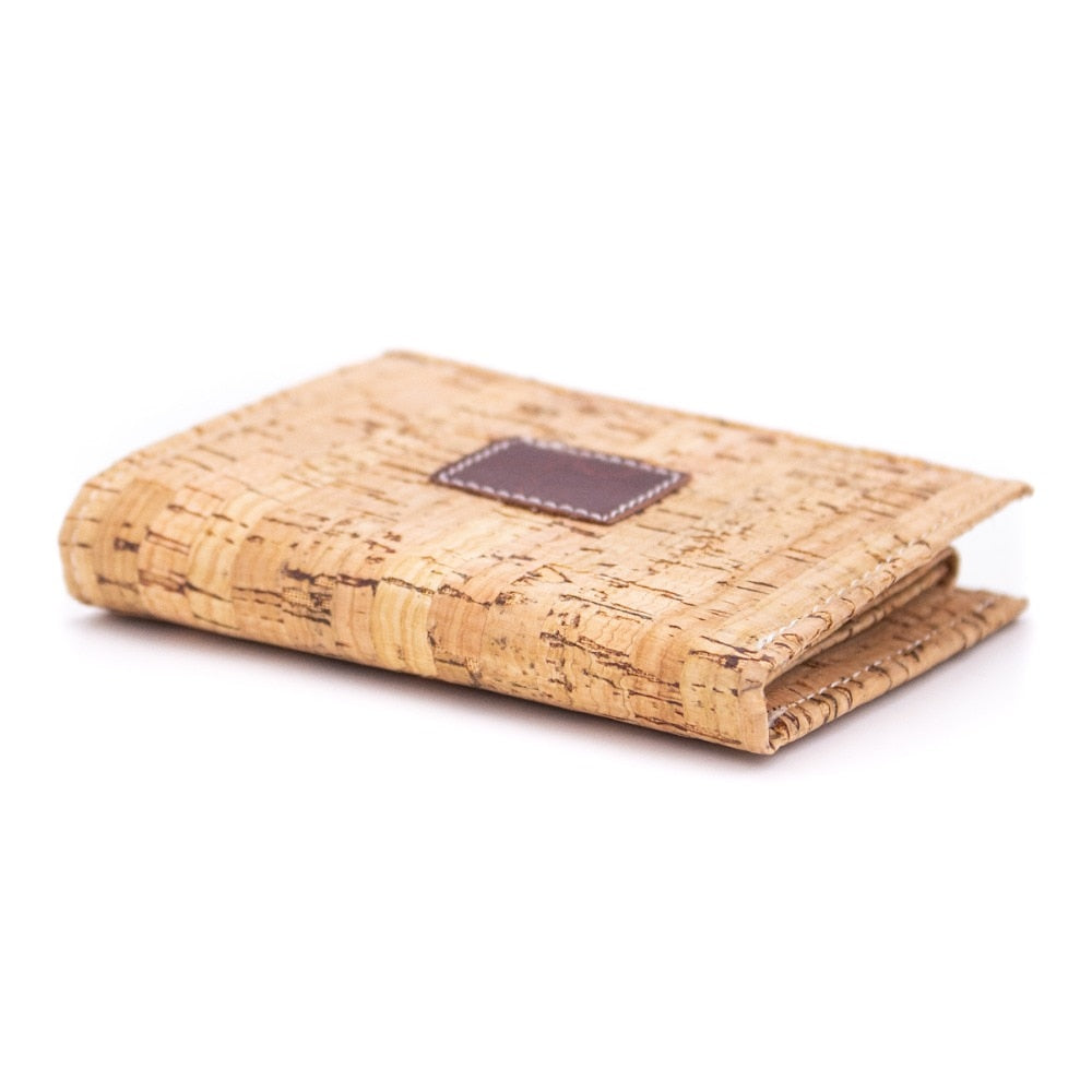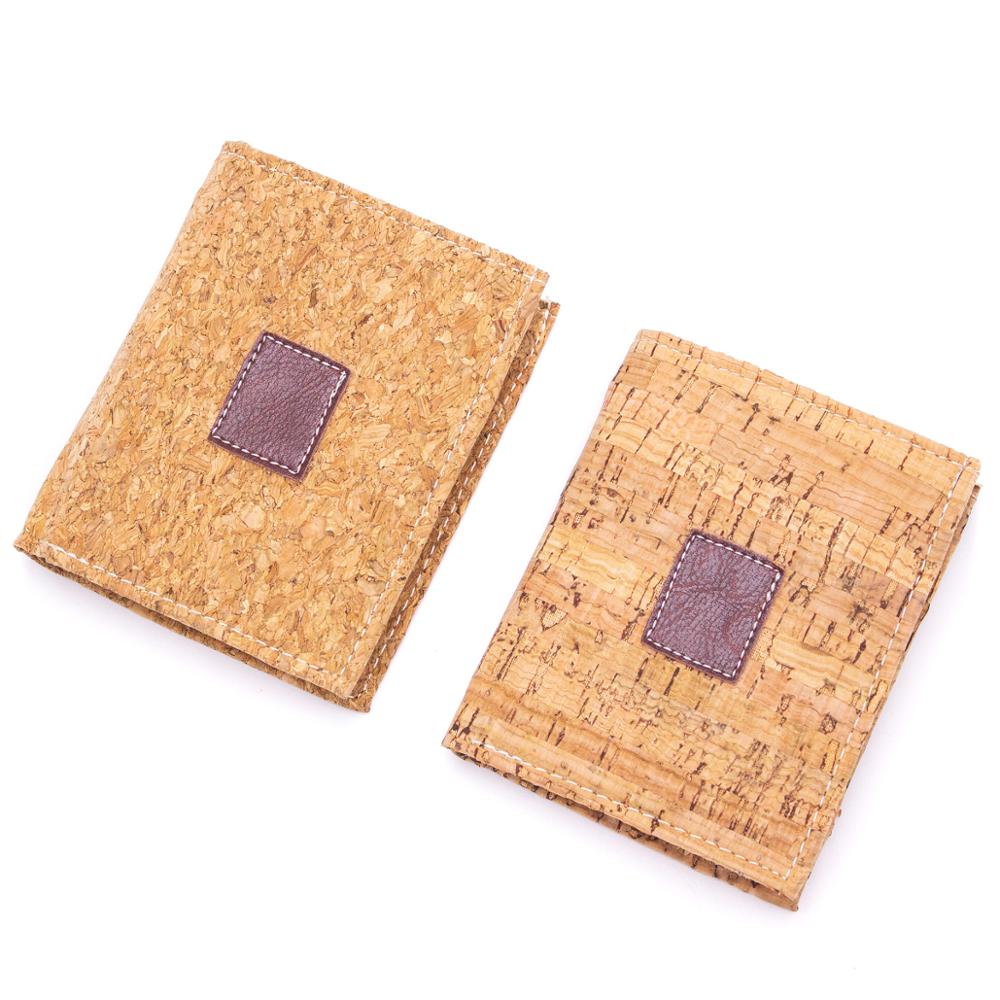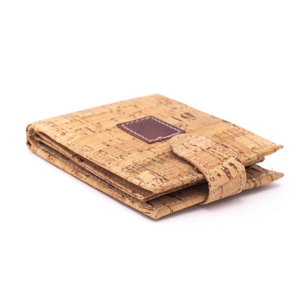 Cartera de corcho que contiene diferentes ranuras para tarjetas,bolsillo para monedas y compartimento para billetes.